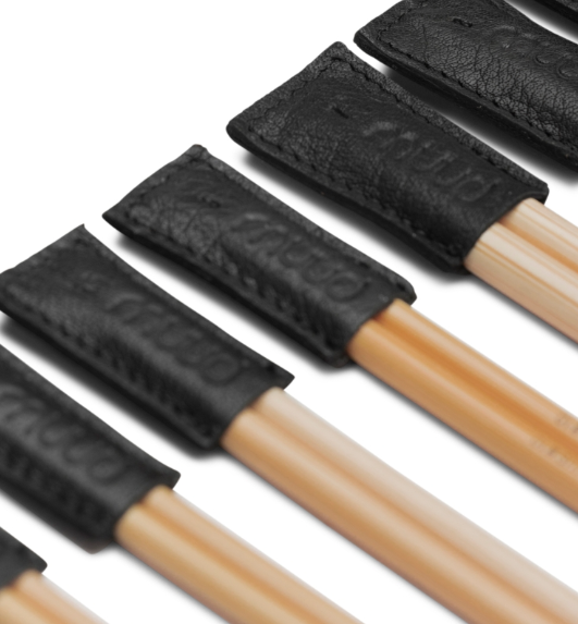 En maskestopper til strikkepinde, der bruges til at forhindre masker i at glide af strikkepindene under strikning. Denne maskestopper er fremstillet af læder og tilbyder både funktionalitet og